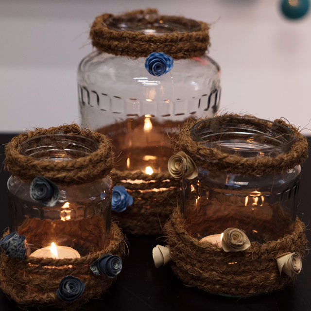 Elszórtan ragasszátok fel a mécsestartóra, majd helyezzetek az üvegbe egy mécsest vagy gyertyát.