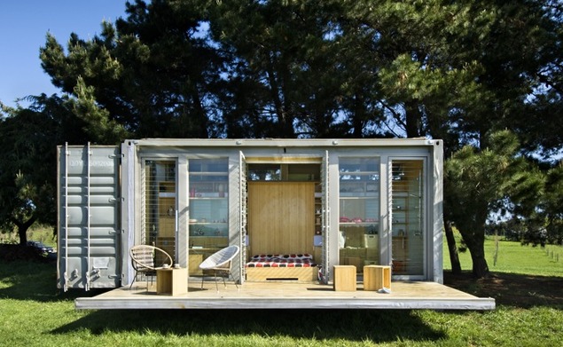 Egy elhasználódott, a funkcióját már betölteni nem képes (a valóságban egy útra tervezett- micsoda környezetszennyezés!) konténert hasznosított újra a Poteet Architecs. Az ötletük az volt, hogy kidobás helyett alakítsák át a konténert egy “kert végében” lepakolható kerti szerszámosnak és vendéghálónak 2 az 1-ben. A tetőszigetelést zöldtetővel oldották meg, kapott árnyékolókat, üvegfelületet, vízbevezetést, és teraszt is az épület. Az alapozó sávot szintén újrahasznosított fa villanypóznákkal oldották meg. Egy kis esztétikai csinosítás, és máris szívesen elugranék kipróbálni Texasba! 🙂 Aki kedvet kapott konténer átalakításhoz, itt akár vásárolhat is magának egyet!